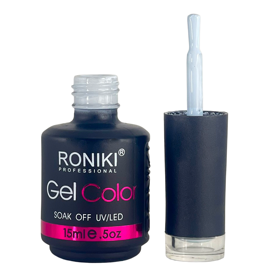 3. Color: aplica 1–2 capas delgadas de esmalte Roniki, curando cada una con lámpara UV o LED de 74 watts por 60 segundos.