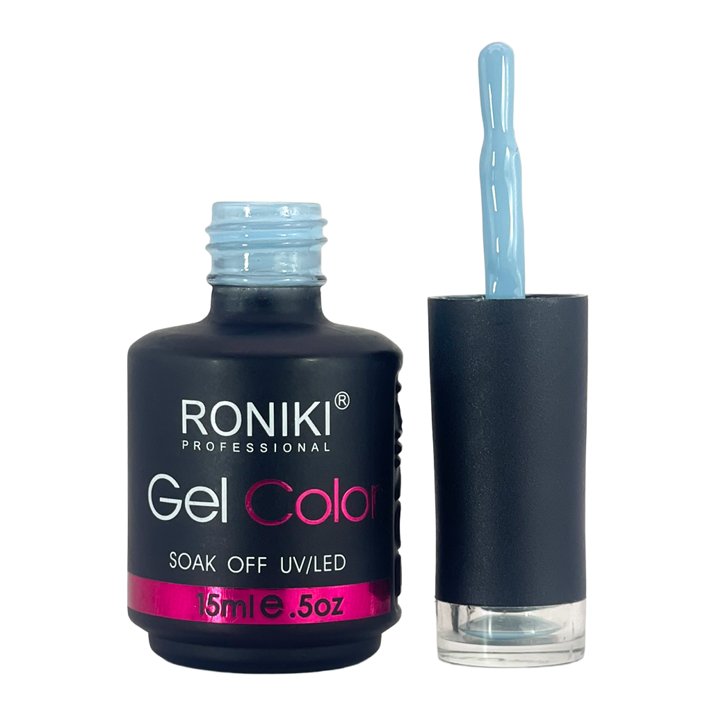 3. Color: aplica 1–2 capas delgadas de esmalte Roniki, curando cada una con lámpara UV o LED de 74 watts por 60 segundos.