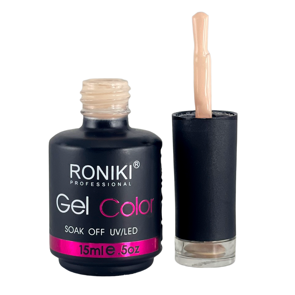 3. Color: aplica 1–2 capas delgadas de esmalte Roniki, curando cada una con lámpara UV o LED de 74 watts por 60 segundos.
