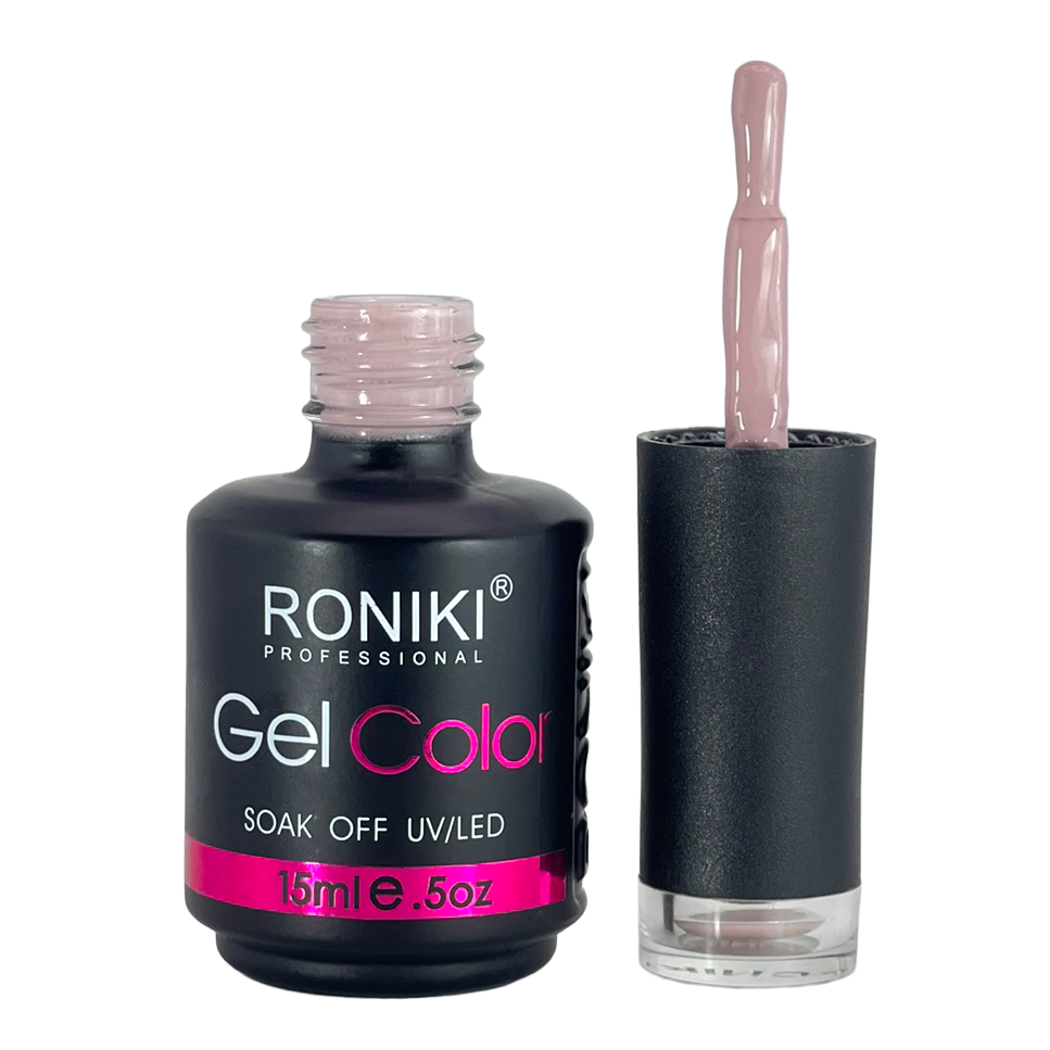 3. Color: aplica 1–2 capas delgadas de esmalte Roniki, curando cada una con lámpara UV o LED de 74 watts por 60 segundos.