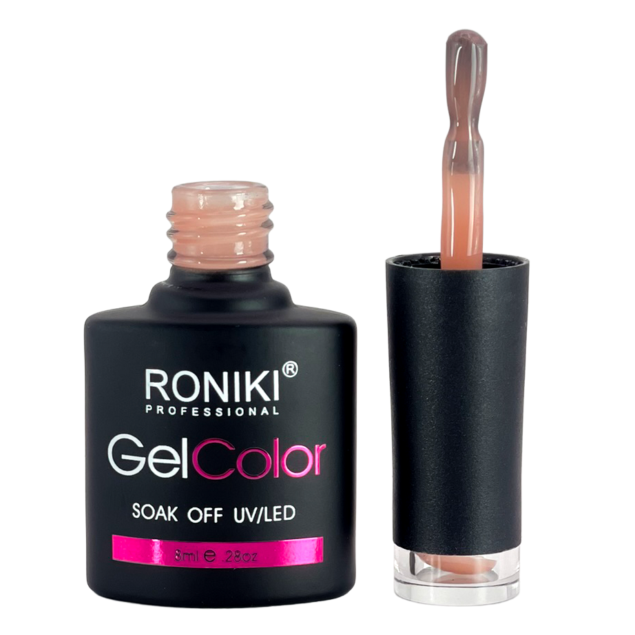 Color: aplica 1–2 capas delgadas de esmalte Roniki, curando cada una con lámpara UV o LED de 74 watts por 60 segundos.
