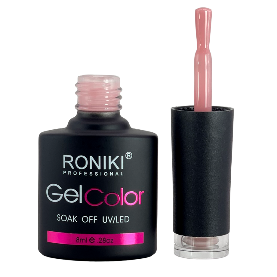 3. Color: aplica 1–2 capas delgadas de esmalte Roniki, curando cada una con lámpara UV o LED de 74 watts por 60 segundos.